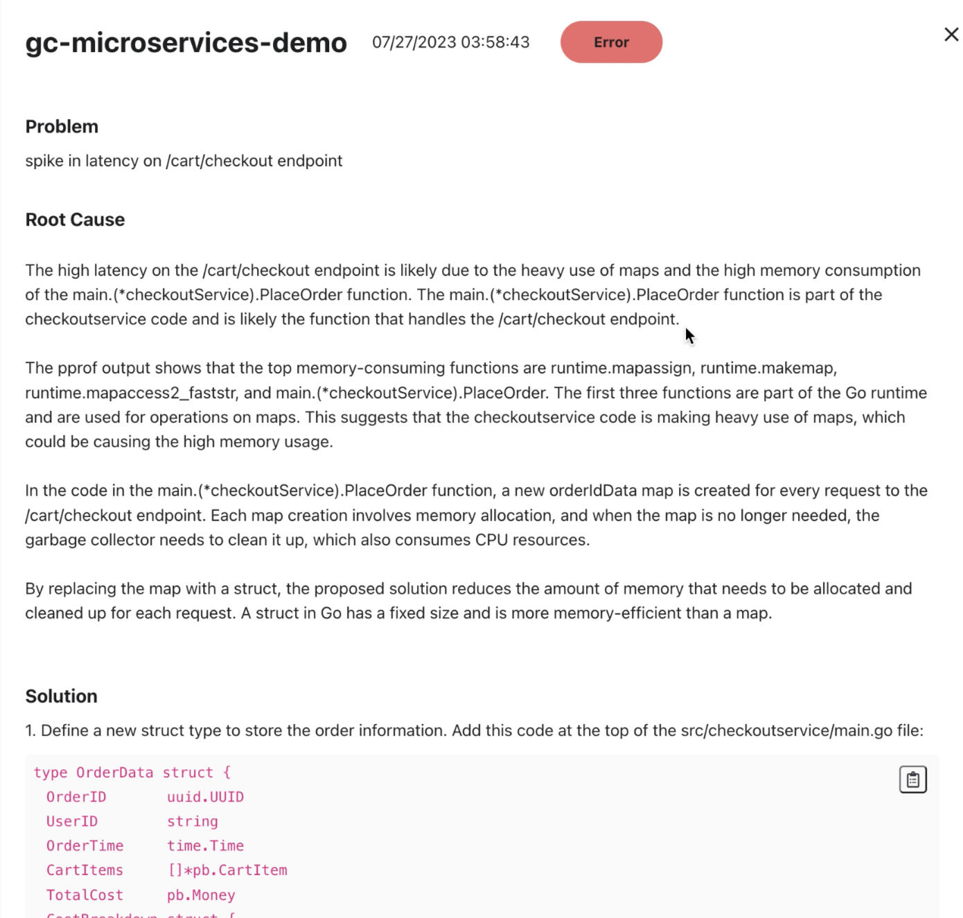 This is fed into our own proprietary algorithm built on top of large language models to determine the root cause, remediation steps, and specific code changes if applicable.
